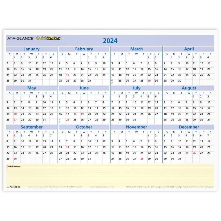 2024 AT-A-GLANCE QuickNotes Reversible Erasable Monthly/Yearly Wall Calendar, 16in x 12in, January to December 2024, PM550B28