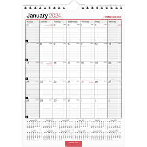 Manage busy time periods with help from this Office Depot Brand Monthly Wall Calendar. The wall calendar features wire binding to help you flip through its pages, and each spread features a yearly calendar for quick reference.