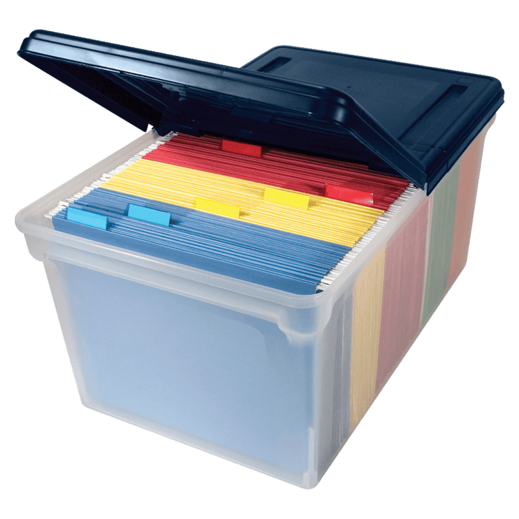 Advantus Extra Capacity Storage File Tote With Lid, Letter Size, 10 13/16in x 23in x 14 1/8in, Clear/Navy