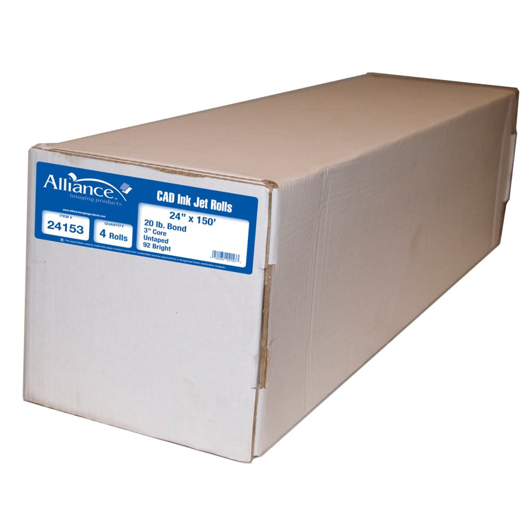 Alliance CAD Bond Paper, 3in Core, 24in x 150ft, 92 Brightness, 20 Lb, White, Pack Of 4 Rolls