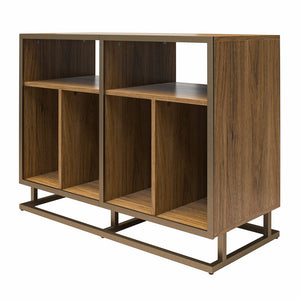 Great for storing turntables and records or for using as a beverage bar, the Ameriwood Home Regal Double-Wide Record Station is a versatile piece. This stand is made of laminated particleboard and metal for strength and stability. The top 2 cubbies are great for record players, while the 4 lower spaces can store records, movies, games and more.
