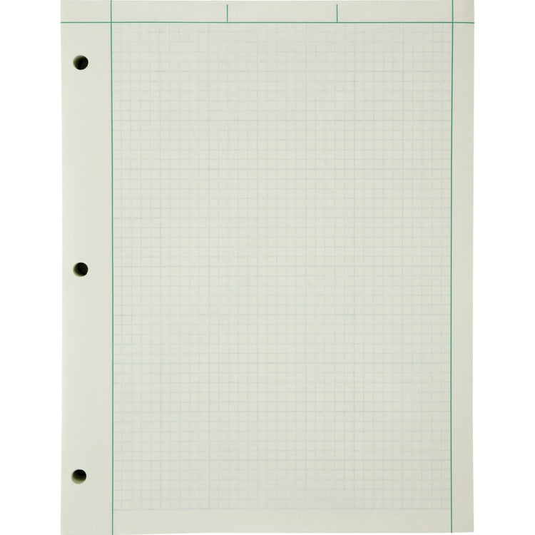 Engineers' quadrille pad features 15 lb. green tint paper that is printed on both sides. Front side is unruled with single margin lines at top and sides. Back side is printed with a cross-section grid of 5 squares per inch.