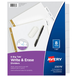 Easily update and reorganize your dividers on the go with Avery Big Tab Write & Erase Dividers. Created with a unique material, each tab can be written on with ballpoint pens or pencils. When you need to make a quick change, just erase your old text to write something new.