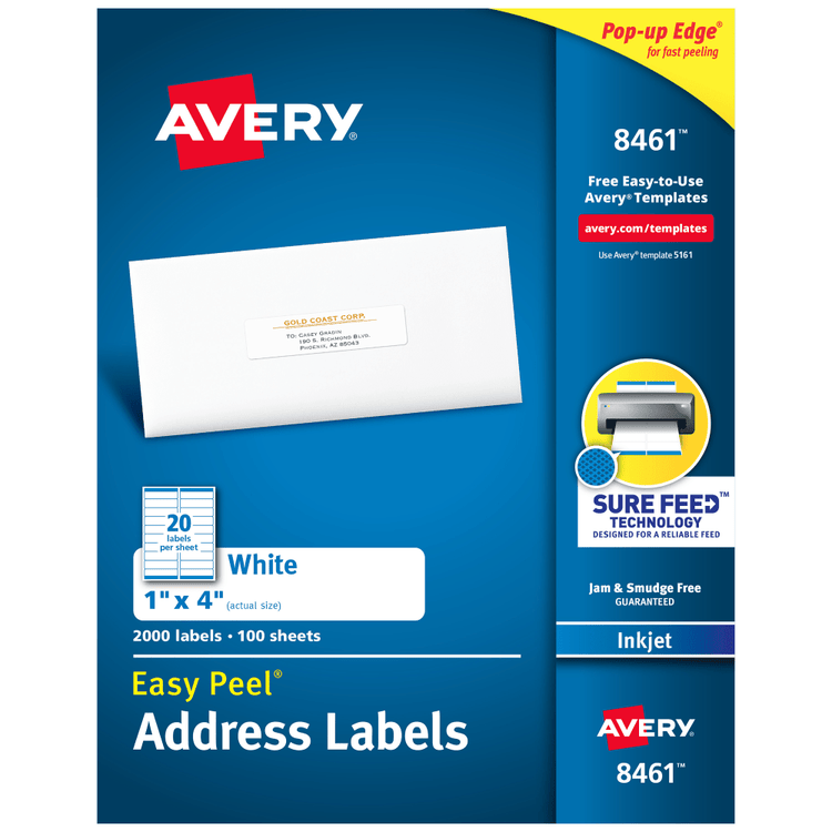 Avery Easy Peel Address Labels With Sure Feed Technology, 8461, Rectangle, 1in x 4in, White, Box Of 2,000