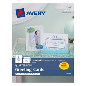 When it comes to special occasions, skip the impersonal texts and emails and make it truly personal with these quarter-fold printable greeting cards with envelopes. Made from matte-coated, heavyweight, printable cardstock, these blank white greeting cards let colors really stand out and come pre-scored for hassle-free folding. Handwrite directly on the blank greeting cards and envelopes for one-of-a-kind creations or get crisp, smudge-free printing on both sides of the cards from your inkjet printer. Effortlessly create customized cards and custom invitations with your own text, art and photos, or use the free templates, designs and fonts from Avery Design & Print. Try it out today on the Avery website. Best of all, this pack of 4.25" x 5.5" blank printable cards comes with envelopes designed to perfectly fit with your cards. Perfect for creating custom anniversary cards, personalized birthday cards, wedding invitation cards, custom thank you cards and more. For expressing sweet sentiments or celebrating special occasions, nothing makes a warm and thoughtful gesture like an Avery greeting card. Item comes with 20 blank cards and 20 envelopes.