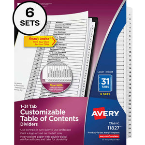 Avery Ready Index Dividers, 1-31 Tab & Customizable Table Of Contents, Letter Size, Black/White ,31 Dividers Per Pack, Set Of 6 Packs