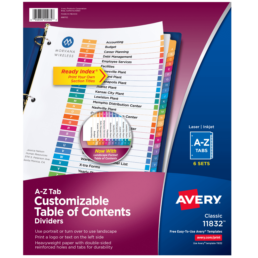 Organize your projects in moments with Avery Ready Index A-Z dividers. Each tab is preprinted and uniquely color coded for a professional appearance. Print your own custom section titles and images onto the table of contents sheet without worrying about labels or inserts. Whether you're creating planners for classes or hosting a presentation, these dividers are ideal for getting everything sorted. Divider sheets measure 8-1/2"x11". The 3 binder holes are reinforced on both sides of the heavyweight sheet to prevent creasing and tearing. Each divider tab includes additional reinforcement along the edge of each page to distribute stress and resist folding.