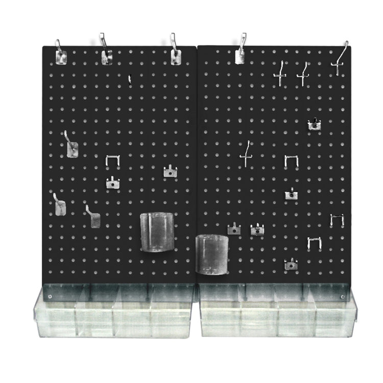 - Includes 2 cups, 2 divider bin trays, 2 pegboard panels, 4 lexan U-hooks, 4 metal J-hooks, 4 metal S-hooks, 6 dividers, 6 metal U-hooks, 8 lexan hooks (2", 4"), 10 metal prong hooks, 10 wire hooks (2", 4") and mounting hardware screws.