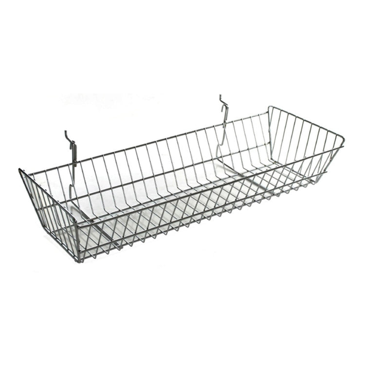 Great for tradeshows or retail facilities, these chrome wire baskets help you display business items. The Azar Displays wide, slanted baskets can even be mounted on pegboards, slatwalls and more to save table space.