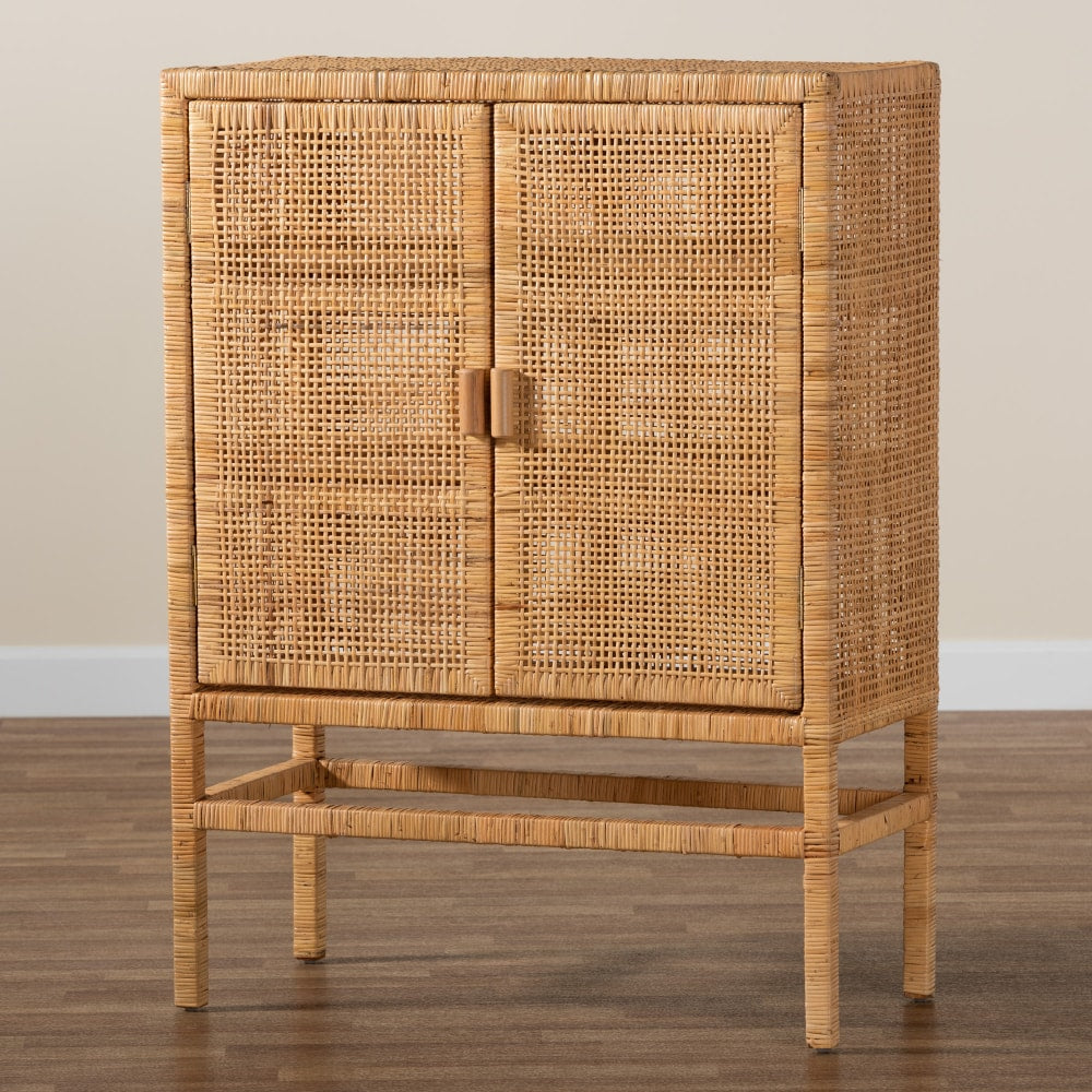 - Storage cabinet features straight legs and woven rattan embellishments.