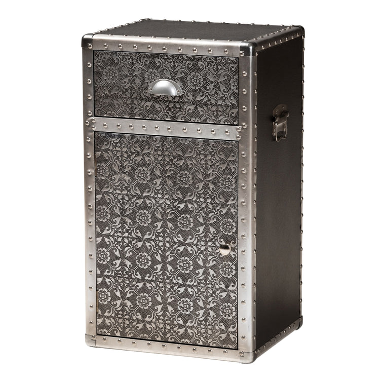 Accent your home with an upscale touch of style with help from Baxton Studio. This sleek cabinet boasts smooth, floral designs and riveted details to add a bold industrial, vintage look to your space. The durable construction encourages lasting use and the drawer and behind-door compartment provide ample storage for your belongings.