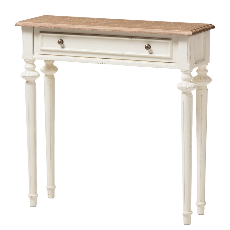 Create a bold, French provincial style to your space when you add this console table. The table offers drawer storage and MDF construction, and its fluted legs provide a stylish touch.