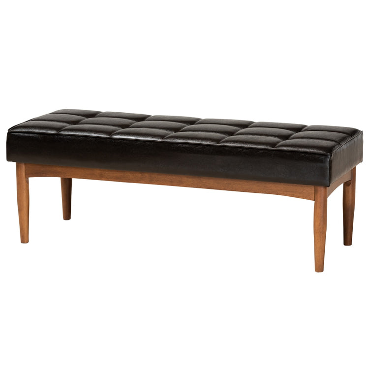 Add modern flair to your dining area with a Baxton Studio Sanford Dining Bench. The sturdy wooden frame offers long-lasting strength. Faux leather upholstery provides a sleek look and is easy to spot clean if a spill occurs.