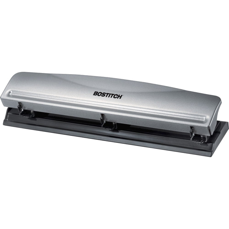 Bostitch 12-Sheet 3-Hole Punch, 2-1/2inH x 10-5/8inW x 1-3/4inD, Silver/Black