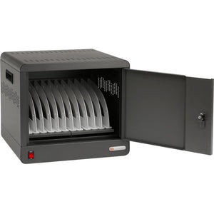 - Sleek Storage: Lockable lower panel conceals adapters safely below devices, which are kept upright and protected.