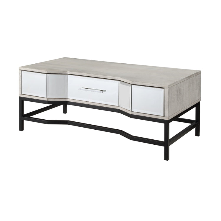 With beveled mirrors and a concave front face, the Coast to Coast Glam Cocktail/Coffee Table is sure to draw attention in your space. The acacia wood veneer and iron construction offers a durable design. Its front can be pull out to offer a full-size drawer, helping you keep your living space tidy.