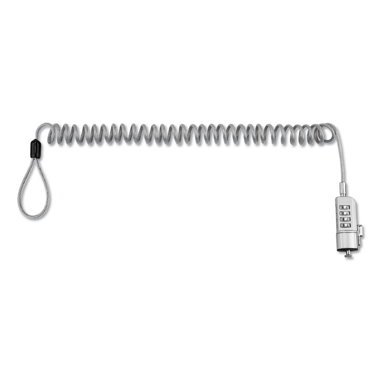 Keyless four-wheel combination. Choose from 10,000 possible combinations. Push-button design allows for easy one-handed installation. Vinyl coated self-coiling cable stores easily and won't mar surfaces. Fits the security slot found in most computers, laptops and peripherals.