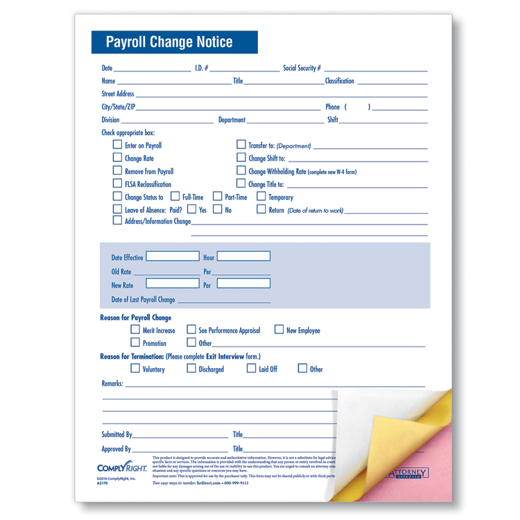 ComplyRight Payroll Change Notice Forms, 3-Part, 8 1/2in x 11in, White, Pack Of 50
