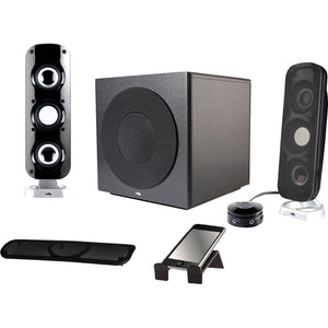 The Cyber Acoustics 2.1 speaker system is designed with a powerful subwoofer for loud and clear sound. The finely tuned satellite speaks ensure the sound stays crisp and the handy cradle holds your MP3 player, iPhone® or iPod® device.
