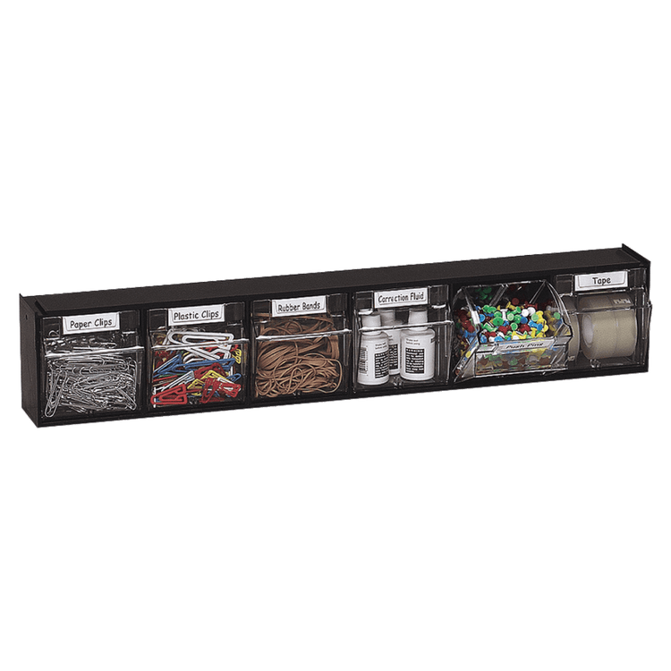 Deflecto Interlocking Horizontal Tilt Bin, 6 Bins, Small Size, 4 1/2in x 23 5/8in x 3 5/8in, Black/Clear