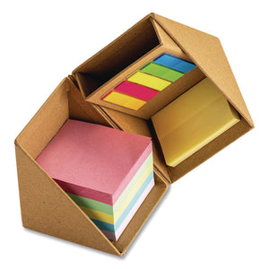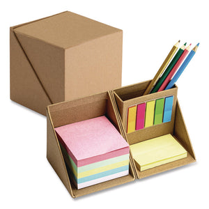 Recycled storage cube that unfolds to display an assortment of sticky notes and a pen holder. Add a touch of "you" to each cube that comes as a blank canvas with unlimited possibilities for personalization. Perfect for office, home, school and classroom. Comes with 500 3" x 3" sticky notes, 100 3" x 2" sticky notes and 100 0.5" x 1.75" page markers in assorted color.