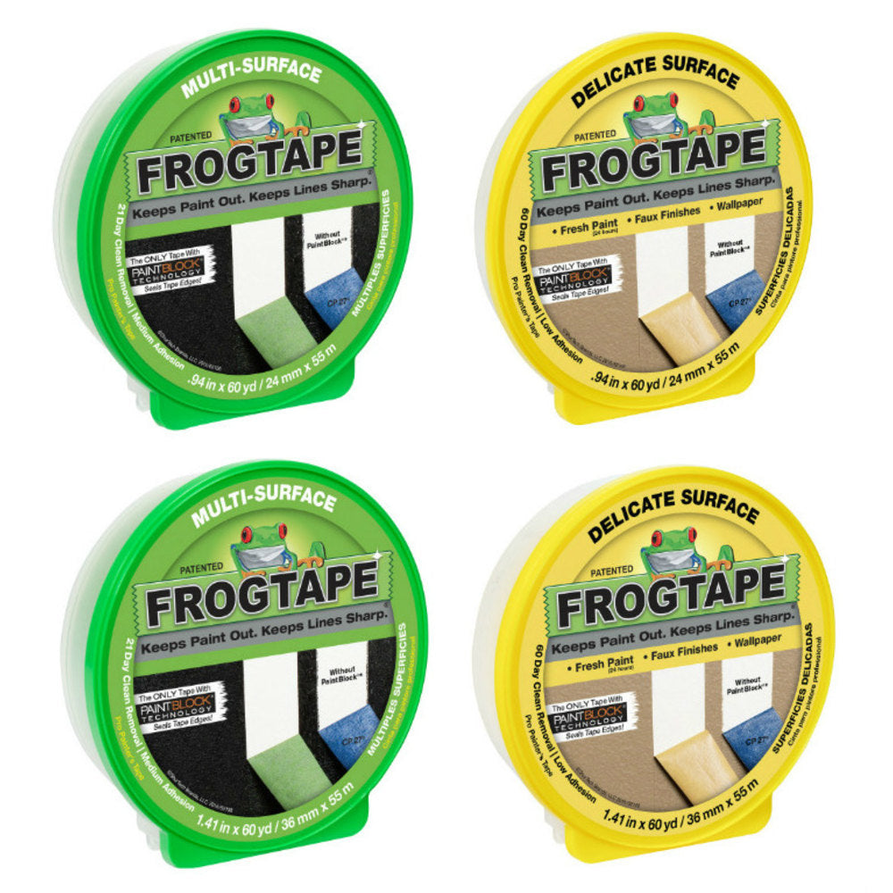 - Comes with 0.94" x 60 yd and 1.41" x 60 yd FrogTape Multi-Surface Painter's Tape rolls as well as 0.94" x 60 yd and 1.41" x 60 yd FrogTape Delicate Surface Painter's Tape rolls.
