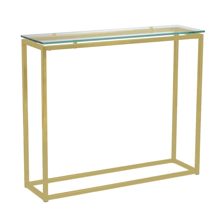 Eurostyle Sandor Console Table, 30-1/3inH x 35-4/5inW x 10inD, Matte Brushed Gold/Clear