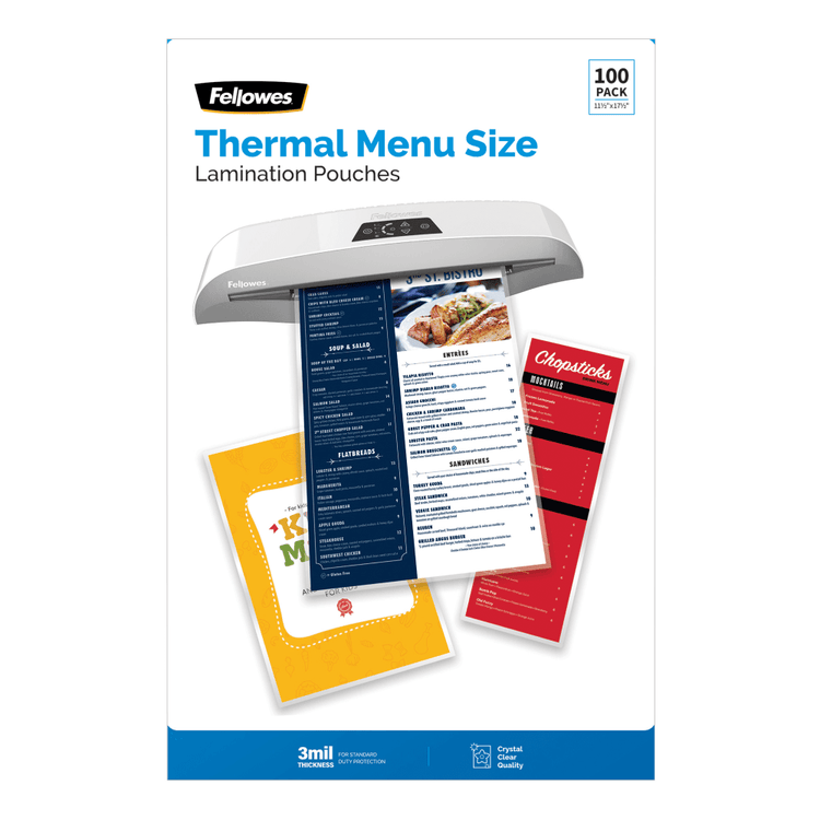 Create clear, easy-to-read menus and other documents that are simple to reuse with the help of Fellowes Thermal Laminating Pouches. They can be used with most thermal laminators to preserve your important documents and photos.