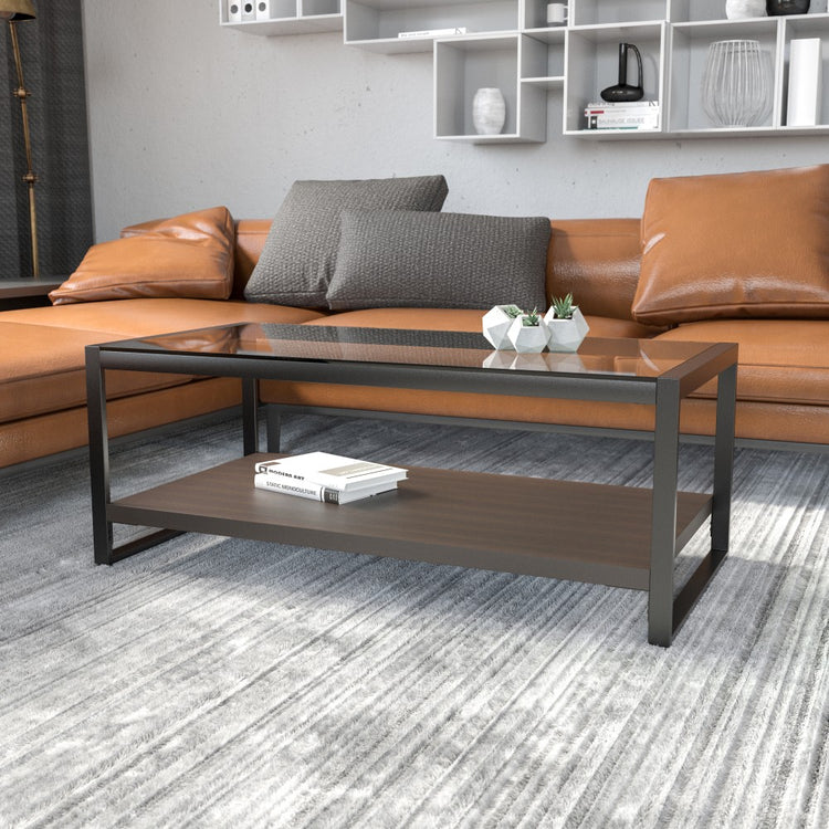 Add some style to your living room by introducing the Flash Furniture Coffee Table With Raised Shelf. Mixed materials add a unique, elegant appearance to your space that guests will appreciate. There's plenty of space on both shelves to organize reading materials, blankets and board games for when visitors come to call.