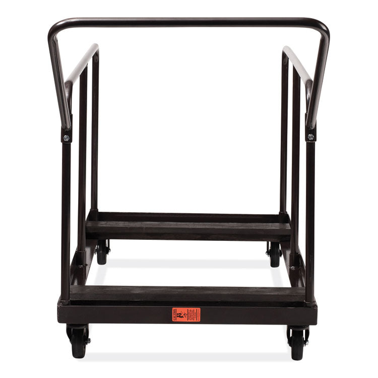 This multi-use dolly easily stores and transports round and rectangular folding tables. Stack up to 10 vertically upright round or rectangular tables (48 to 60 dia, 72 to 96 length) on this sturdy, tubular steel dolly. The brown scratch-resistant powder-coated paint finish resists chipping even after years of rigorous use. This dolly has two side handles, a convenient handlebar and four hard rubber casters (two that swivel) for easy maneuvering. Each caster boasts a 165 lb weight capacity for a total of 660 lbs.