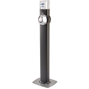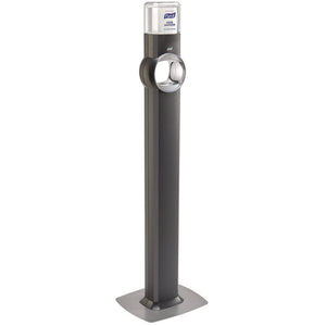 Premium, reliable touch-free dispenser stand for PURELL Hand Sanitizer. An elegant floor stand that reinforces high quality standards, while complimenting any décor. Includes Four "C" cell batteries—no tools required for replacing batteries. Multi-directional design unlocks new placement possibilities wherever hand hygiene is needed. Uses same AT-A-GLANCE™ refills as PURELL ES6, making it easy to monitor product levels with just one look. Seamlessly integrated tray to help maintain cleanliness. Low-profile baseplate maximizes stability and hides dirt.