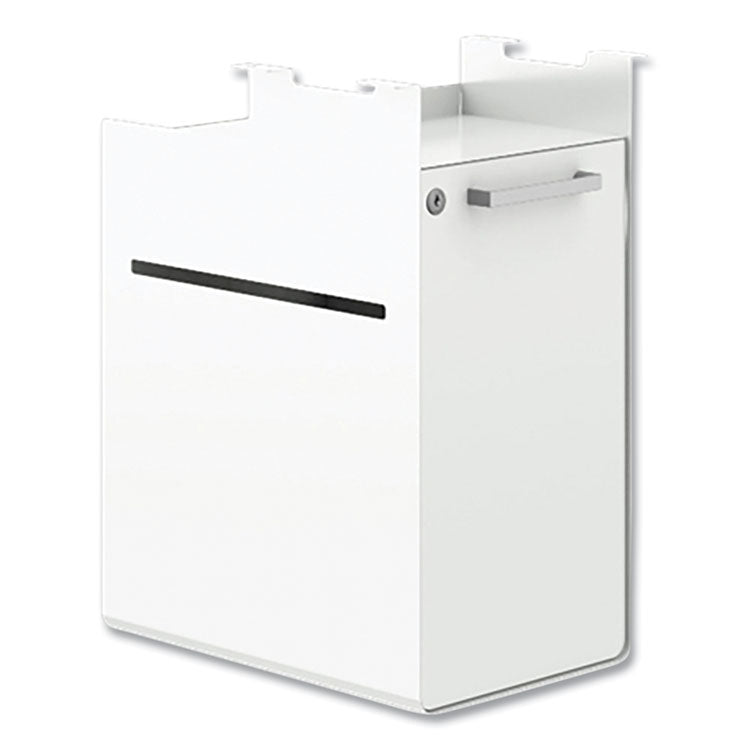 With a completely modern take on form and function, Fuse™ storage adds personality to any home office or corporate workspace. This undermount unit mounts flush to the underside of a worksurface to not only save floor space, but to allow your storage to move up and down with an adjustable-height worksurface. This model features a lockable door to help you safely conceal everything from work supplies to snacks to sneakers. Fuse™ Workplace Tools hang from the side to provide easy access to personal items, while freeing up valuable space inside the cubby for larger pieces.