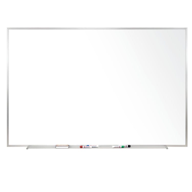 Give the rest of the room an easy view of notes by writing on this magnetic whiteboard, which features a dry-erase surface. The wear-resistant design and enameled surface protect against damage, and the frame is made of sturdy metal with end caps.
