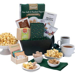 - Basket includes kettle corn, peanut butter crunch, Colombian coffee, hazelnut coffee, tea sampler chest and 6 sachet cinnamon pecan straws.