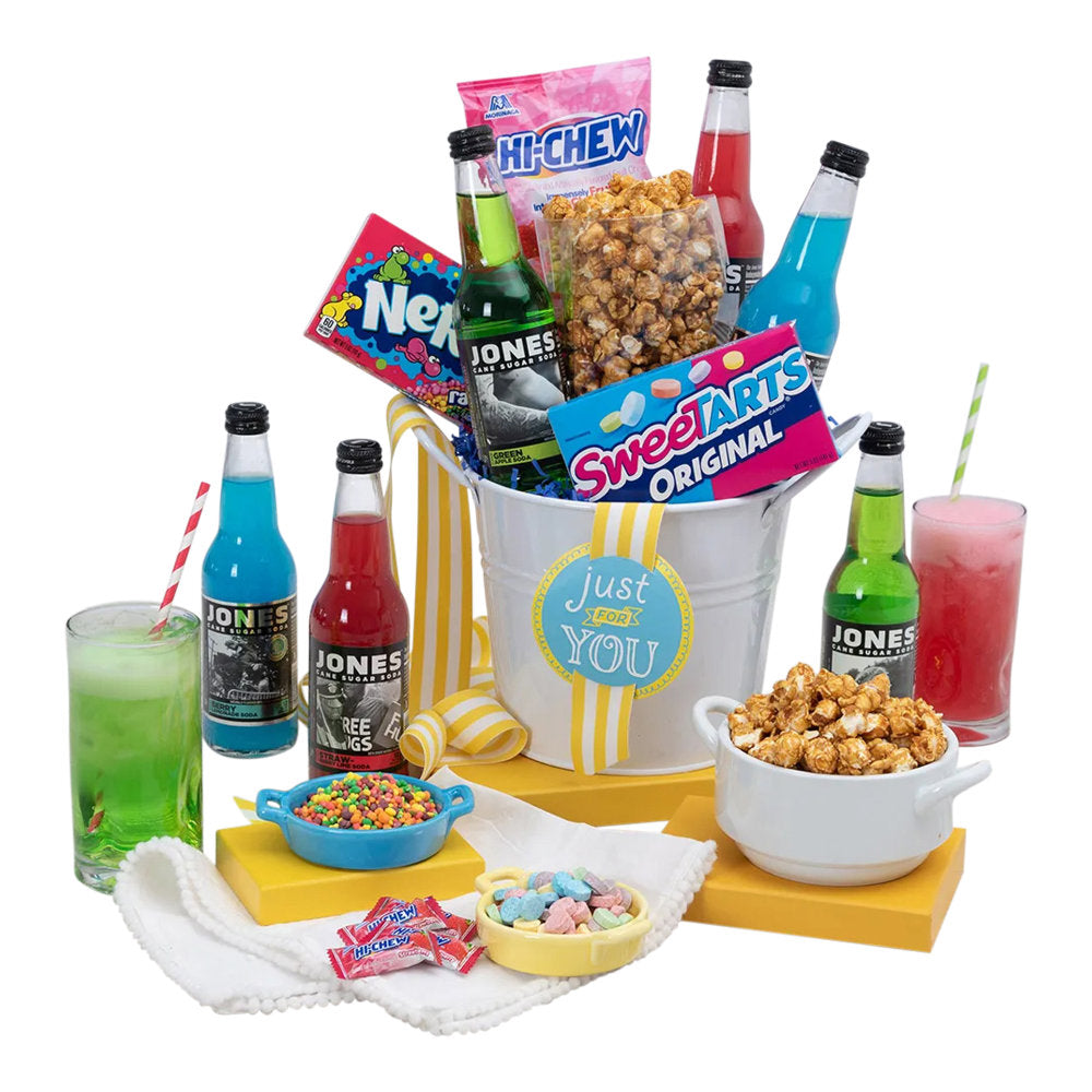 Kick off movie night with the Gourmet Gift Baskets Just For You! Soda Bucket. The soda bucket comes with everything a movie night needs, including soda, candy and popcorn.
