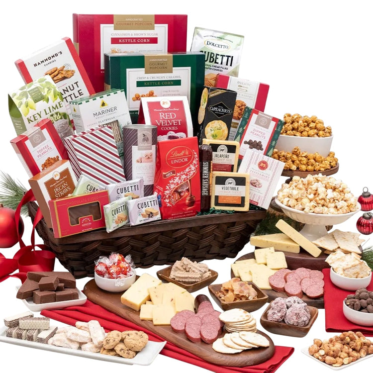 Celebrate the holidays with the Gourmet Gift Baskets The Corporate Show Stopper Christmas Gift Basket. This basket comes with an assortment of sweet and salty snacks, making it ideal for giving to clients and employees.