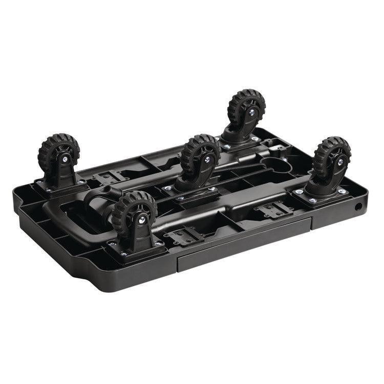 Lightweight and compact. Easy to carry and stow. Folds flat. Heavy duty construction. Manufactured of lightweight aluminum and durable impact resistant polypropylene plastic. Height-adjustable telescopic handle has three height positions. Incline feature to adjust angle of the handle for easier transport; 90 degree for handcart function, 150 degree for dolly option. Large platform with expandable width feature from 12.5" wide to 14.5" wide. Expanded width provides better stability for large items. Five 3" ball-bearing casters for easy maneuverability and transport; two casters fixed, three casters have 360 degree swivel. Comes fully assembled. Includes two bungee cords to secure items being carried.