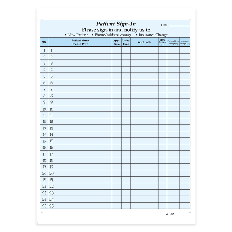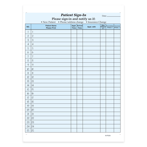 The 2-part patient sign in sheets help you maintain HIPAA compliance and patient privacy. The forms allow your patients to sign in, your staff to maintain records and keep your practice compliant. Each form has 25 lines with a peel away section which can be applied to the patient's chart. The back sheet records all the names of the patients that signed in for the given day.