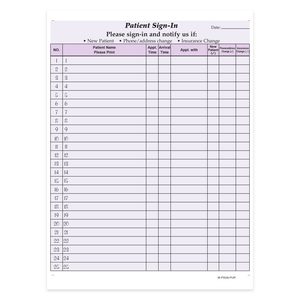 The 2-part patient sign in sheets help you maintain HIPAA compliance and patient privacy. The forms allow your patients to sign in, your staff to maintain records and keep your practice compliant. Each form has 25 lines with a peel away section which can be applied to the patient's chart. The back sheet records all the names of the patients that signed in for the given day.