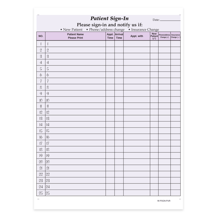 HIPAA Compliant Patient/Visitor Privacy 2-Part Sign-In Sheets, 8-1/2in x 11in, Purple, Pack Of 1,000 Sheets