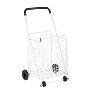 This folding shopping cart is in it for the long haul—literally. This sturdy companion will roll along with you to the grocery store and back home again, handling curbs and corners like a champ. With a 50-lb capacity, it's also great for transporting laundry to the laundromat, moving tools to the garage, or toting sports gear to the park. The handle has soft rubber grips so you can push the cart all day. The white metal frame is tough, yet folds down simply when you need to put the cart away.