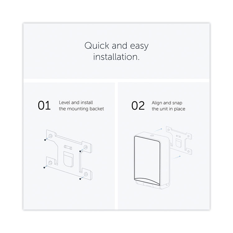 The Kimberly-Clark Professional ICON™ dispensing system is changing the face of the restroom. Featuring first-of-a-kind versatility, the ICON™ dispenser effortlessly enhances the look of the restroom with an exclusive line of designer faceplates to help reimagine the space. These dispensers feature our patented, interchangable faceplate technology and complement the other ICON™ paper towel and toilet paper dispensers in the collection. Select one of our six signature faceplate designs. Touchless operation is critical to maintaining the highest levels of hand-hygiene, and these dispensers will deliver up to 60,000 uses on one set of batteries. Custom mounting bracket with built-in level for easy installation. Can be used with our Kleenex Botanics Soap and Sanitizer, or any of our Scott brand automatic skin care refills.