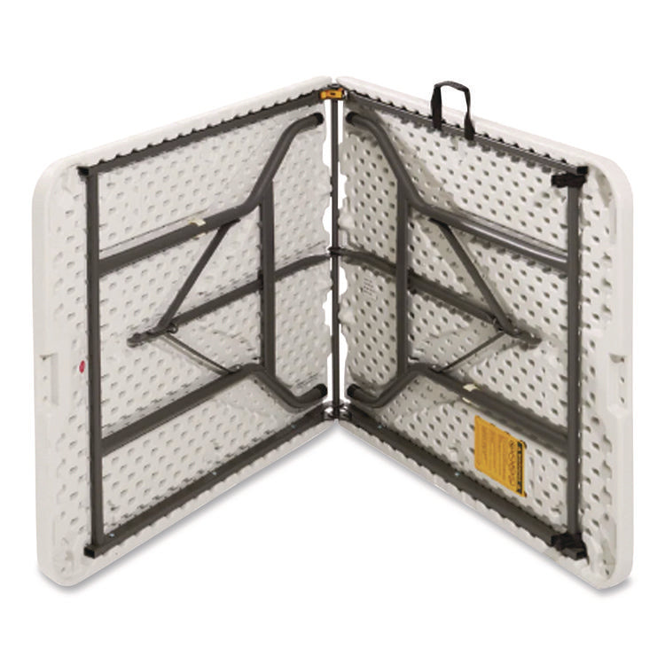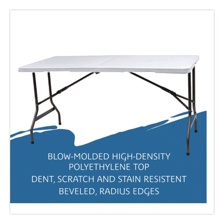 Sturdy, multipurpose tables not only fold in half, but they also feature a convenient built-in handle for easy transport. Lightweight, with a contemporary-look design, no matter your intended purpose, this table is set to please. Wherever portability, quick set-up and sturdy durability are sought, this table is poised to meet your requirements, whether you need a platform for products and merchandise at trade shows, fairs and outdoor markets or you just need to accommodate extra guests at parties, weddings and barbeques. Dent- and scratch-resistant, easy-to-clean top is fabricated of blow-molded high-density polyethylene and features soft-beveled radius edges. Powder-coated, round metal-tube legs feature fold-out braces for extra strength and stability. Ideal for indoor and outdoor use. Tables nest together when stacked, with their legs folding into protective channels, to help maximize your available storage space.