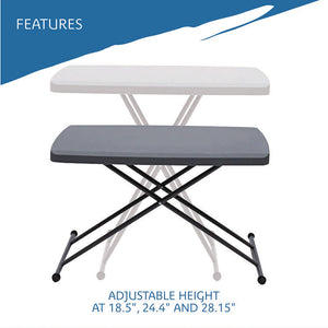 Lightweight, durable and portable. The perfect size table provides extra space. The dent- and scratch-resistant top is easy-to-clean and is constructed of blow molded high-density polyethylene. Heavy gauge, sturdy 1" steel tube legs, with charcoal gray powder coat finish, folds into recessed channels for easy storage. Height is adjustable at either 25" or 28". Ideal for indoor or outdoor use.