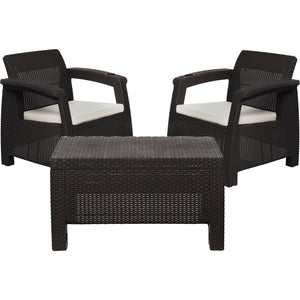 The MQ Ferrara Stay Outdoor Furniture Set by Inval is a fashionable 3-piece patio set. It features 2 single seat armchairs and a coffee table finished in a rich resin material with an attractive Rattan look.