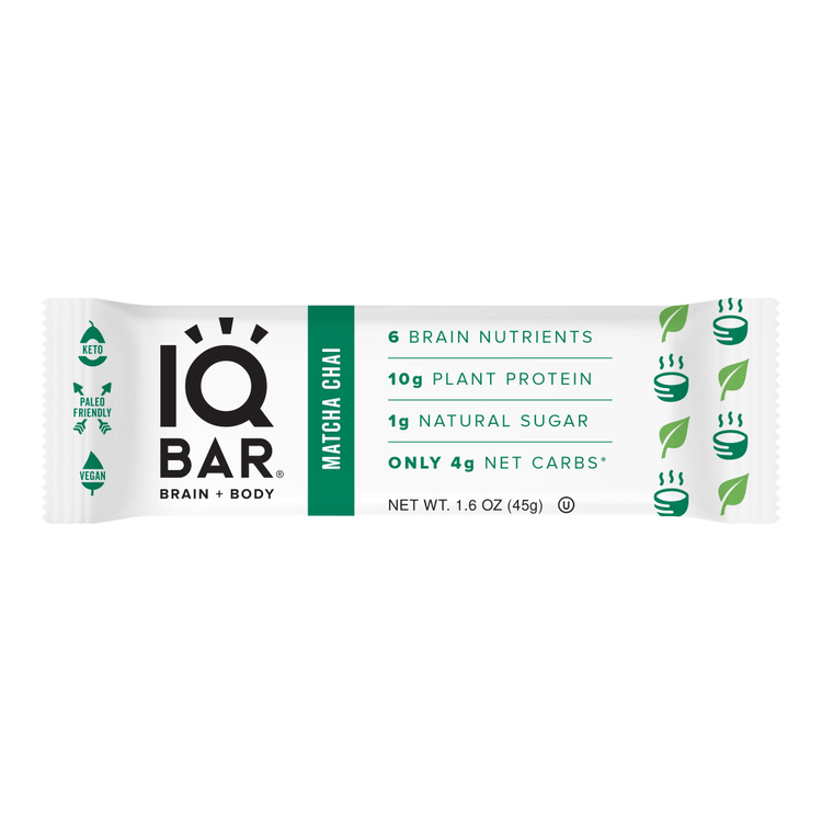 IQ BAR Brain Fuel Protein Bars, Matcha Chai, 1.6 Oz, Box Of 24 Bars