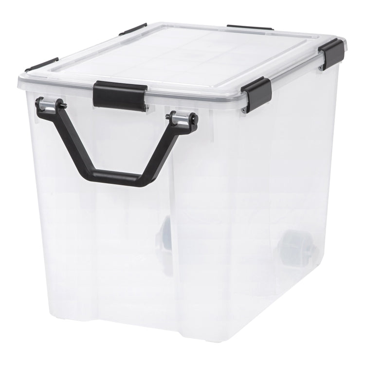 Make sure your items stay clean and dry in storage with this IRIS WEATHERTIGHT storage box. It has back wheels and a pull handle, so you can fill it all the way and wheel it wherever you need to go.