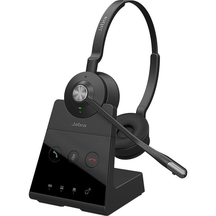 The Engage 65 DECT stereo wireless headset has a 150m/490' range and an integrated busy light. Use this Jabra Engage black headset all day with its battery life that lasts up to 13 hours.