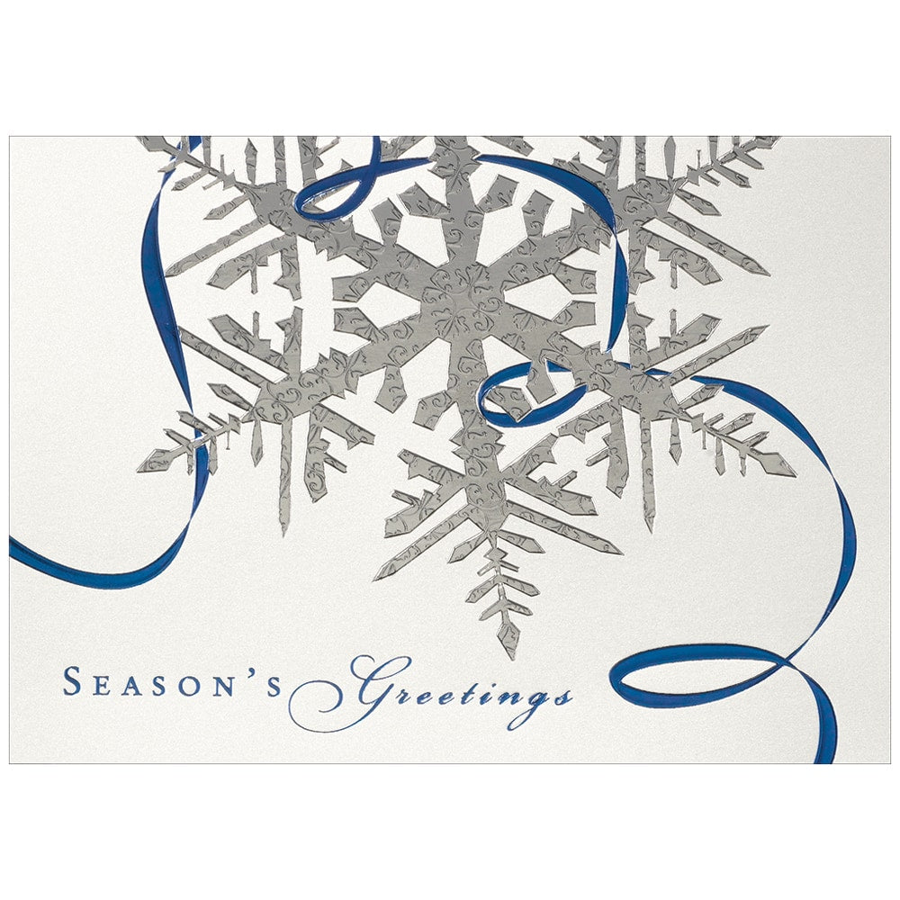 - Holiday Card with a silver foil snowflake design on pearlized stock