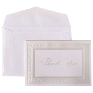 JAM Paper Thank You Card Set, 4 7/8in x 3 3/8in, 65 Lb, Bright White/Pearl Border, Set Of 104 Cards And 100 Envelopes